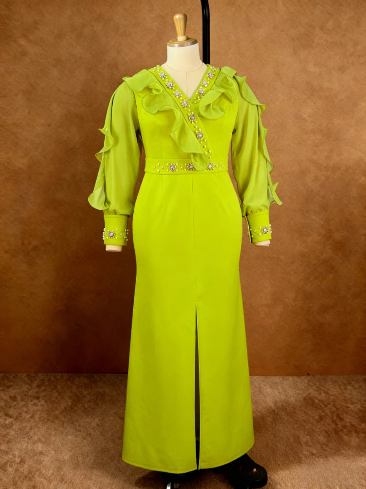 The Luxury Women Party Peplum Maxi Dress features a V-neck design and long sleeves, enhancing elegance for formal occasions. Its bodycon fit emphasizes the figure, while the thigh-high slit offers ease of movement. This dress is ideal for weddings and evening events, combining style with comfort for a sophisticated look.
