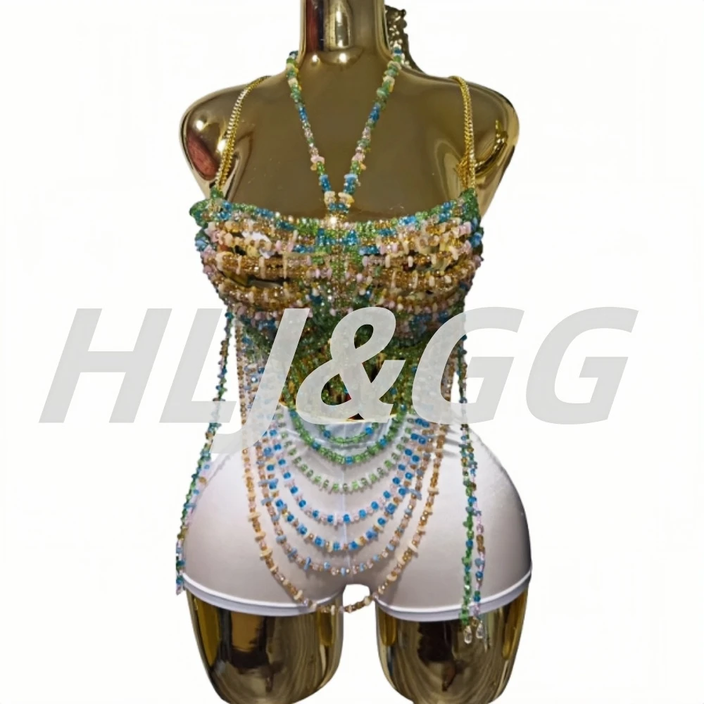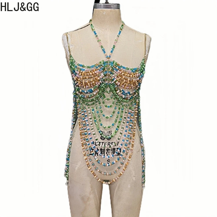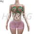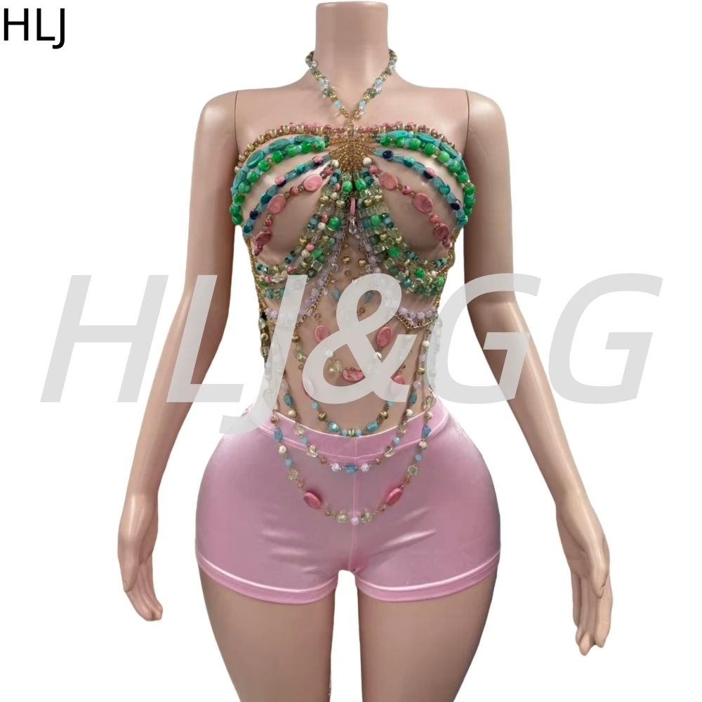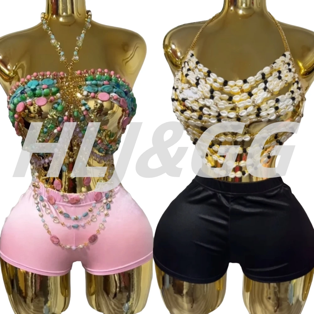 Sexy Beading Camisole Vest Hollow Out Two Piece Sets Women Sleeveless Backless Irregular Top And Shorts Club Streetwear