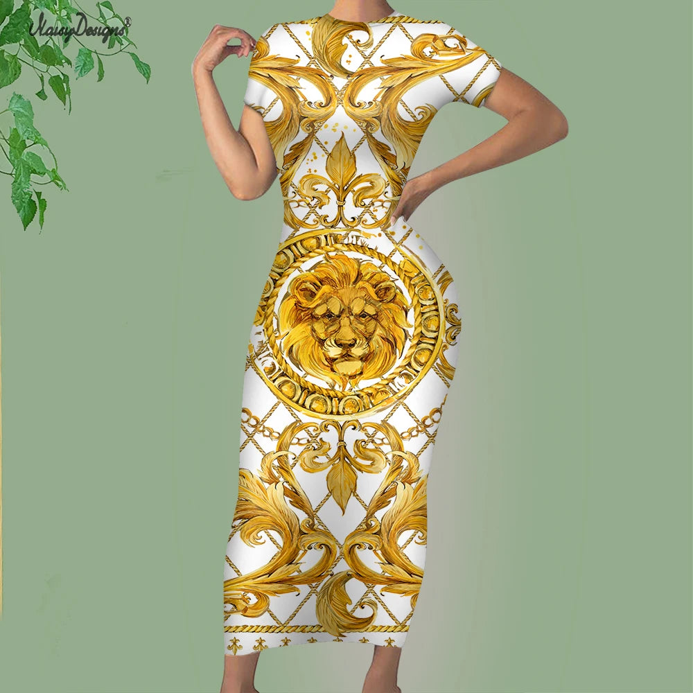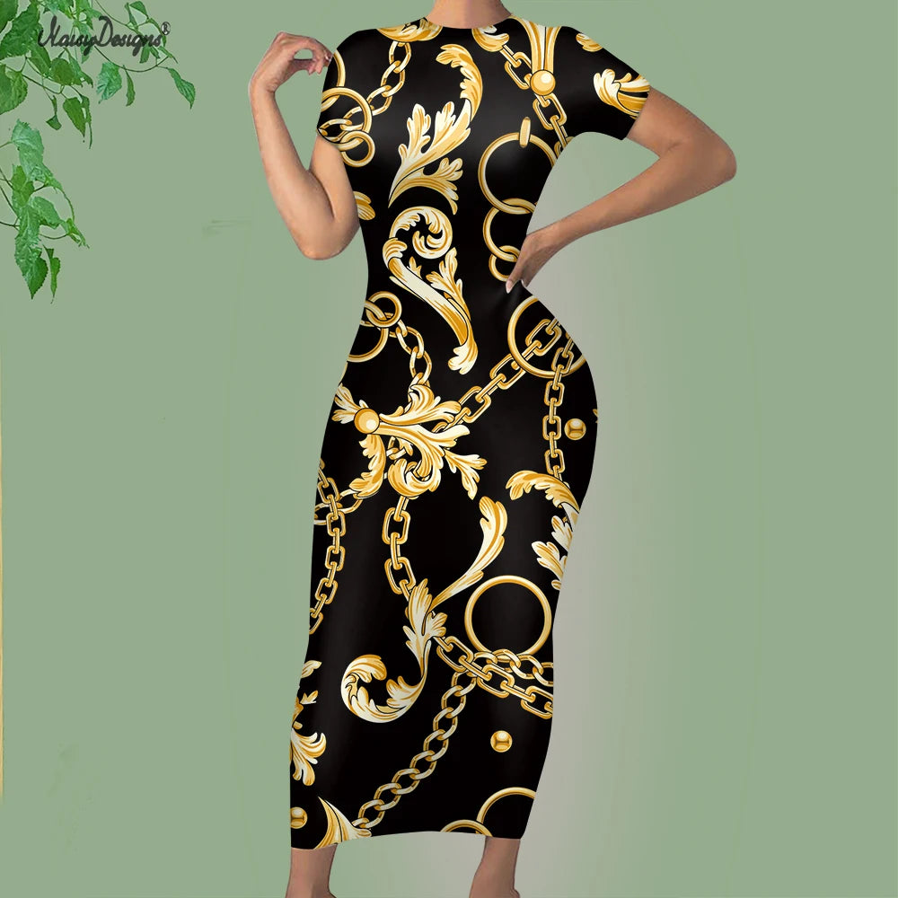 Noisydesigns Luxury Golden Europe Floral Women Party Dress Fashion Elegant Ladies Round Neck Sexy Bodycon Dress.