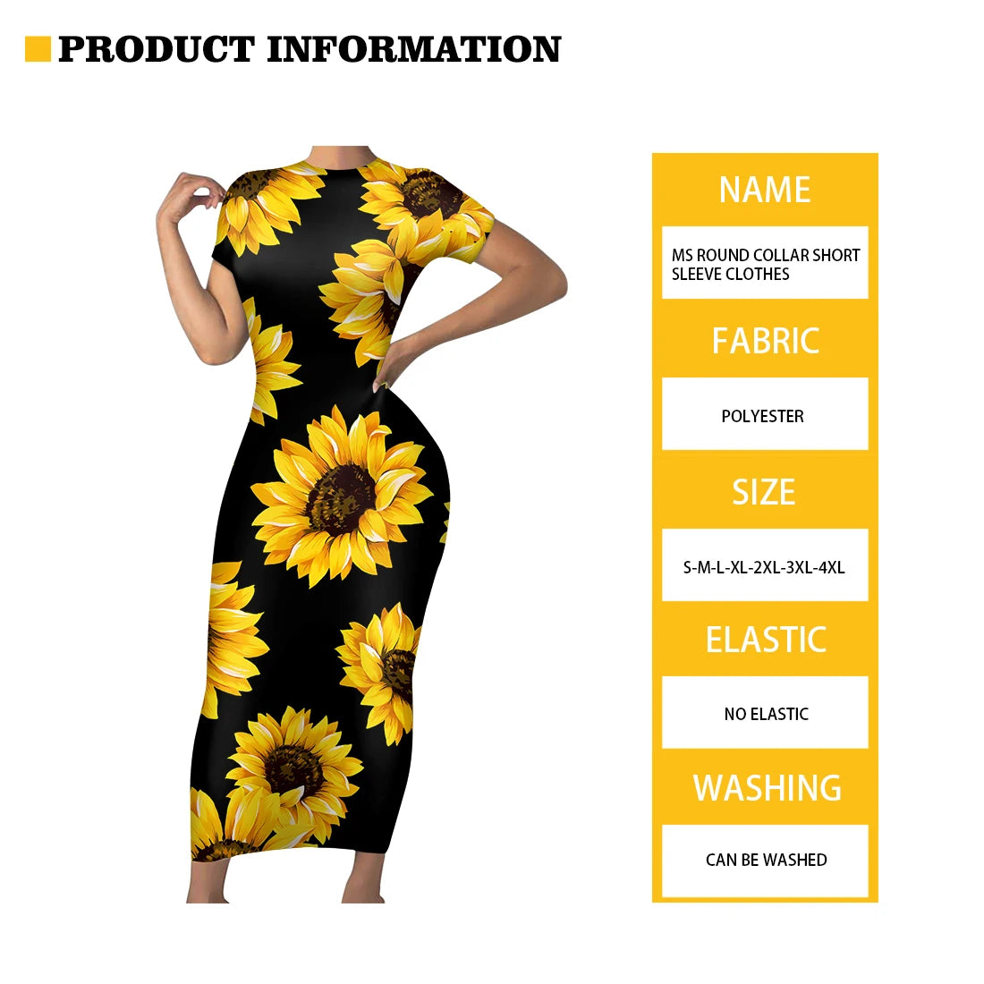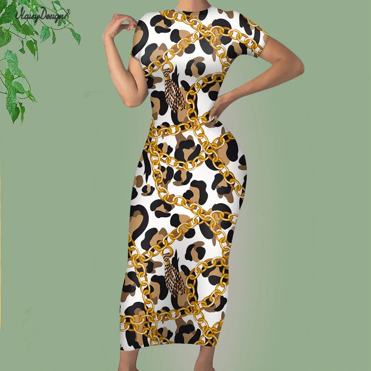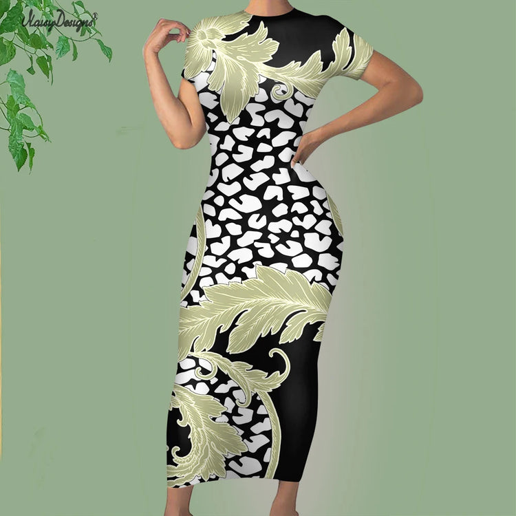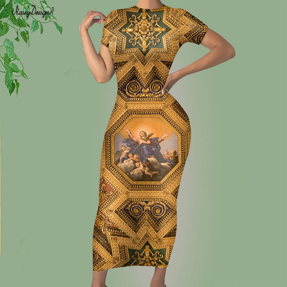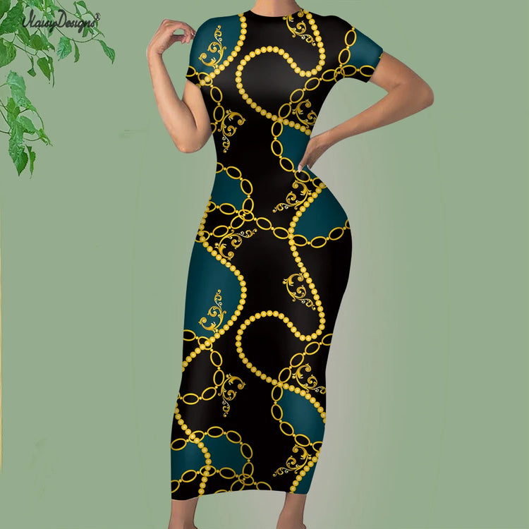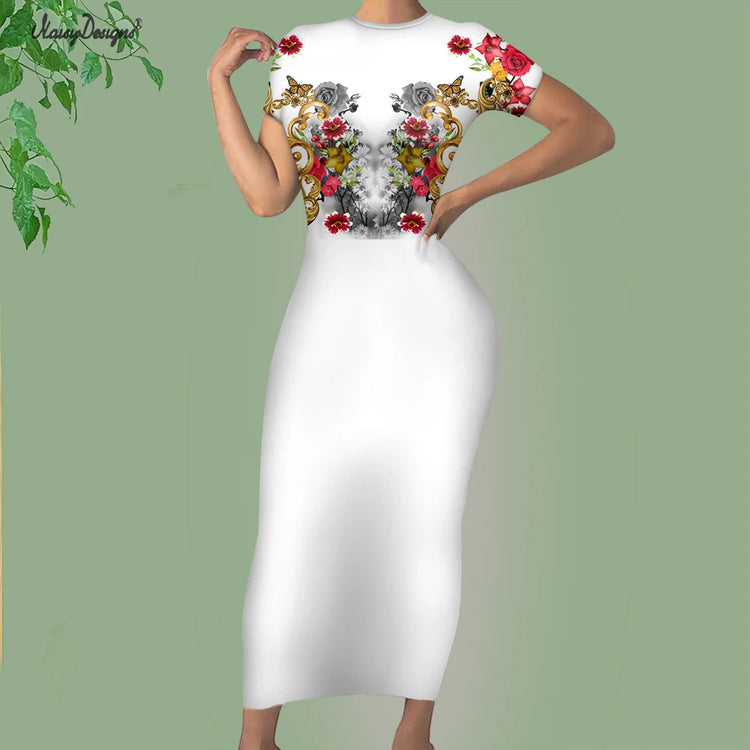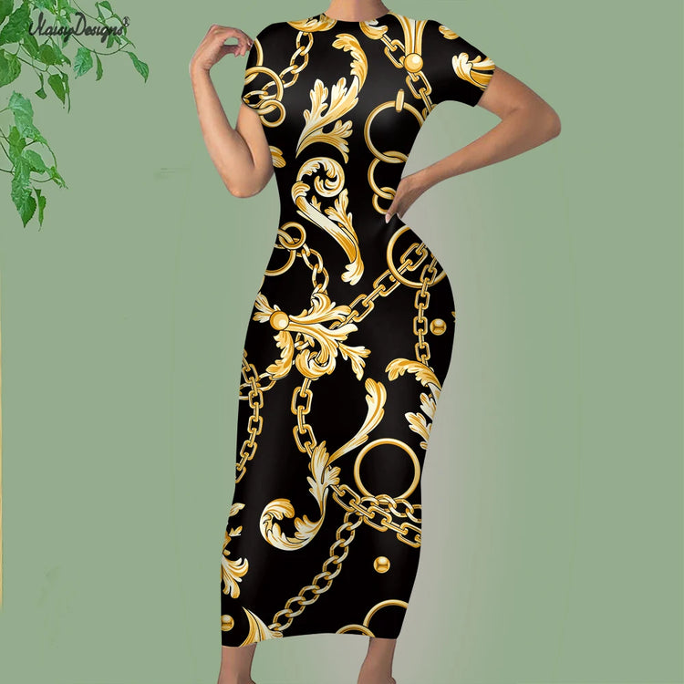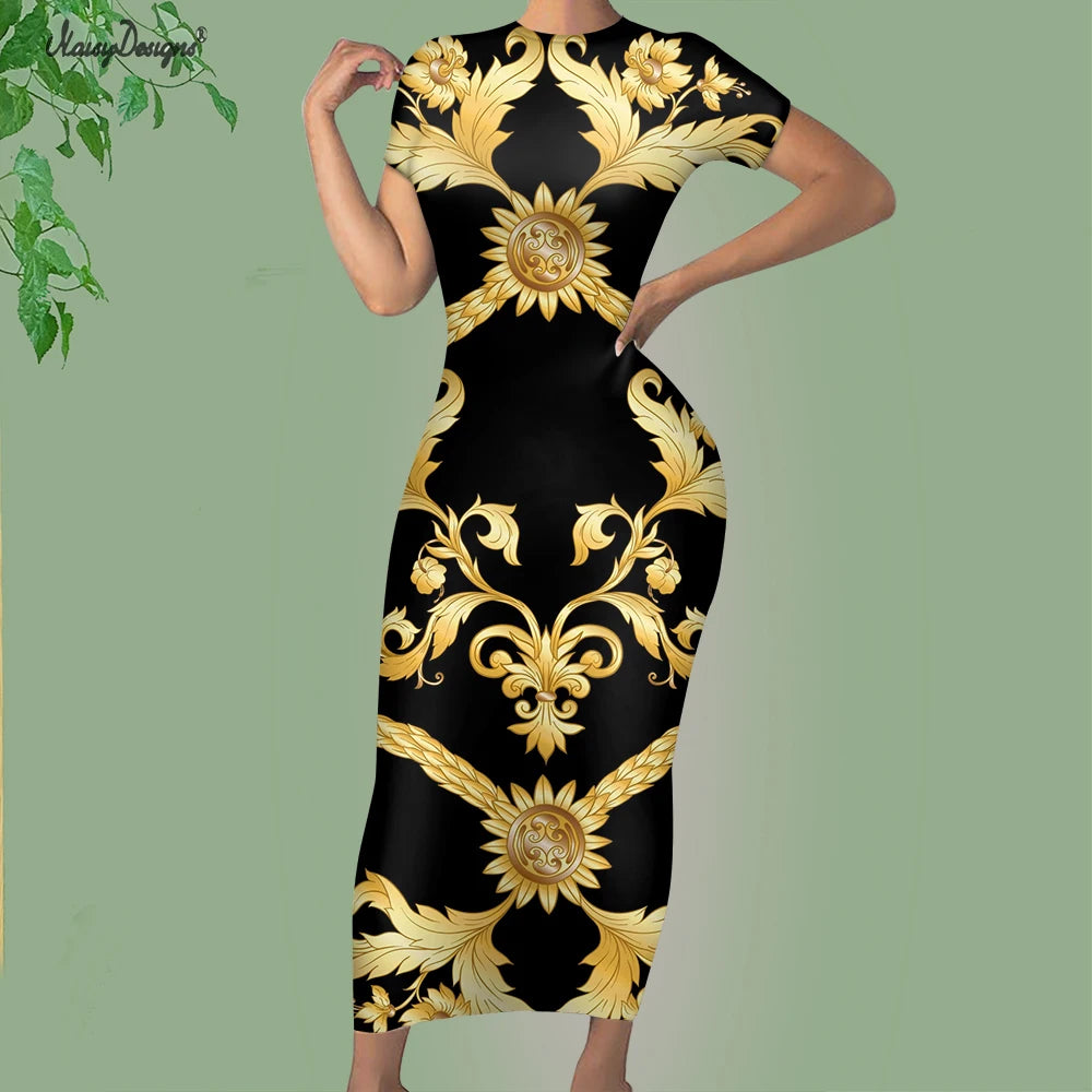 Noisydesigns Premium Golden European Floral Women’s Evening Dress, Fashionable and Elegant Ladies’ Round Neck Bodycon, Available in Size 4XL for Dropshipping.