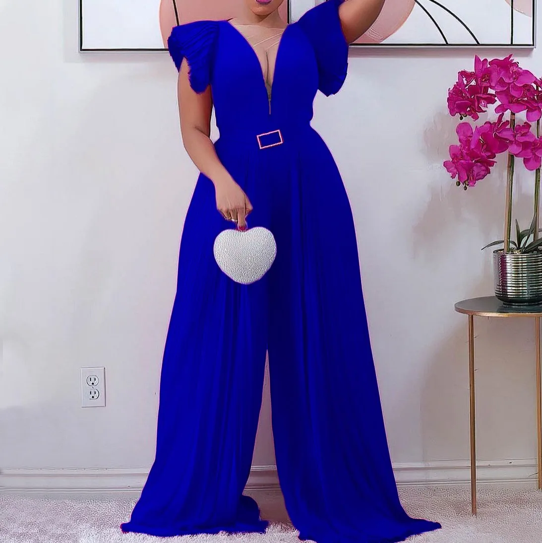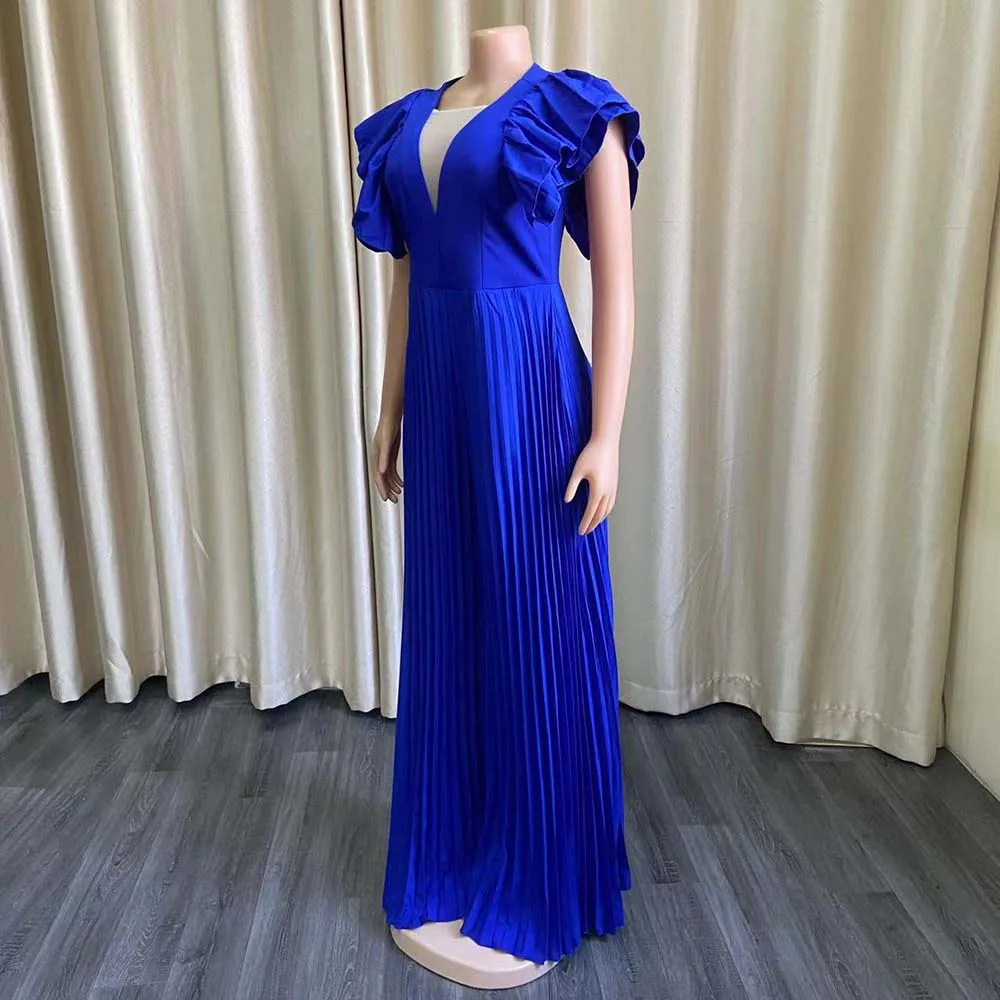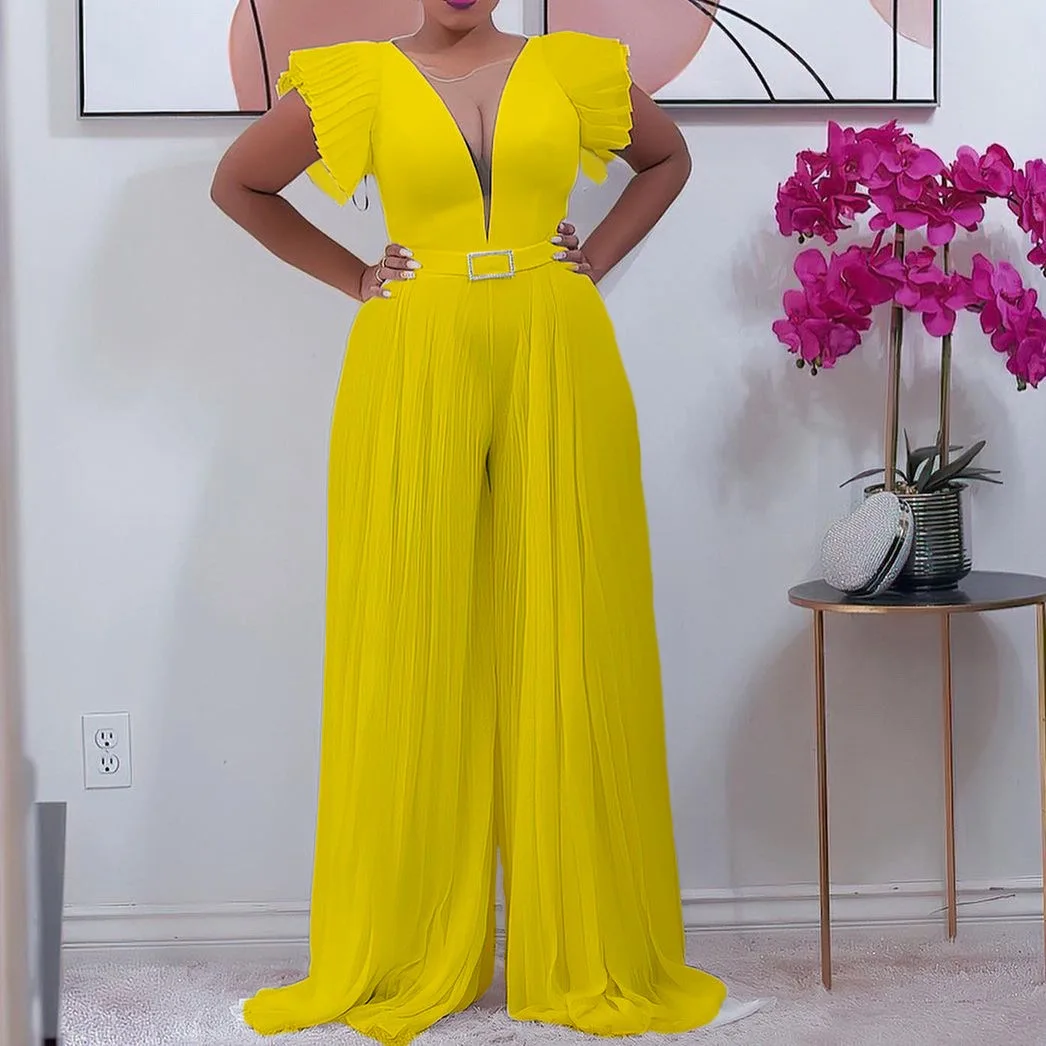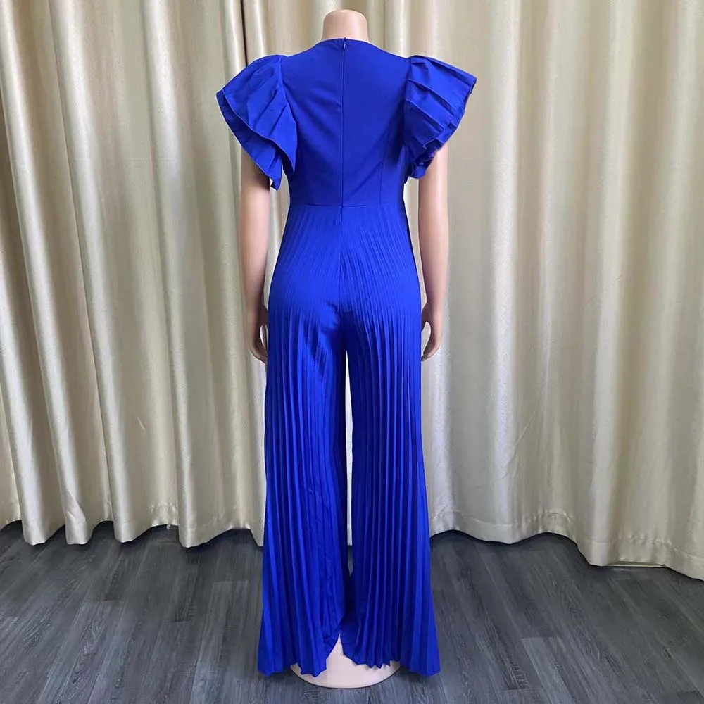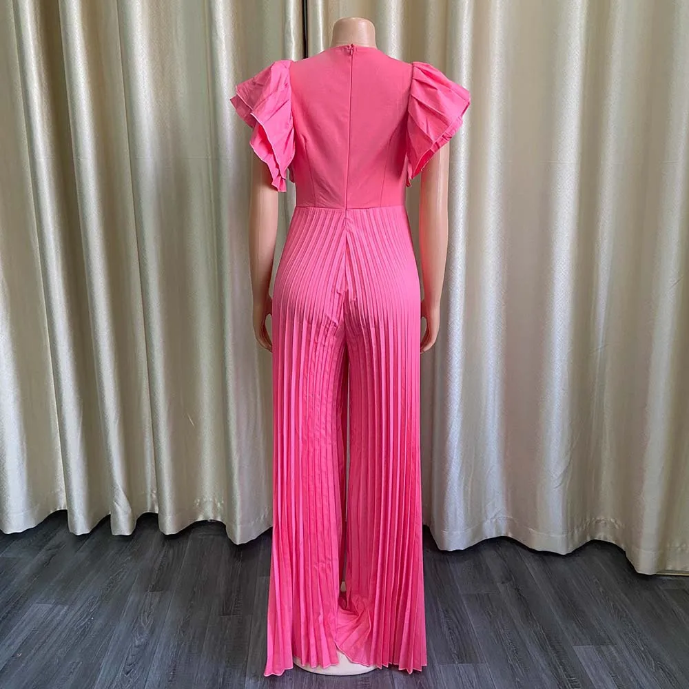 The Pleated Jumpsuit for Women features a V-neck design with ruffled sleeves and a high-waisted silhouette. This garment is crafted to enhance comfort and style, making it suitable for various occasions. The pleated fabric provides a flattering fit while allowing for ease of movement.