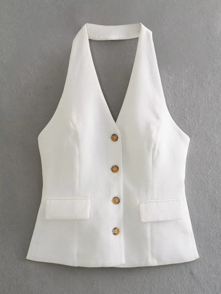 The Halter Neck Collar Blouse and pleated Wide-leg Pants Suit presents a refined combination of elegance and comfort. The halter neck feature accentuates the neckline, whereas the pleated wide-leg pants facilitate mobility. This 2-piece suit is suitable for adaptable styling across multiple environments.