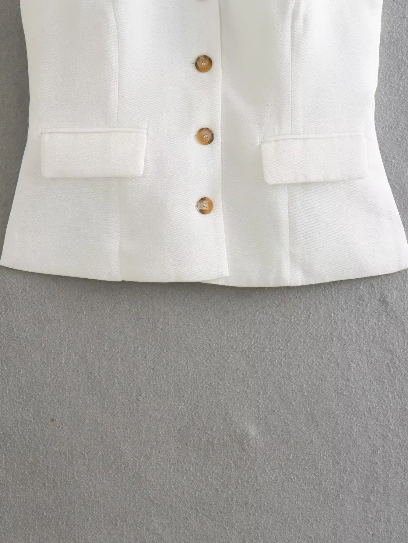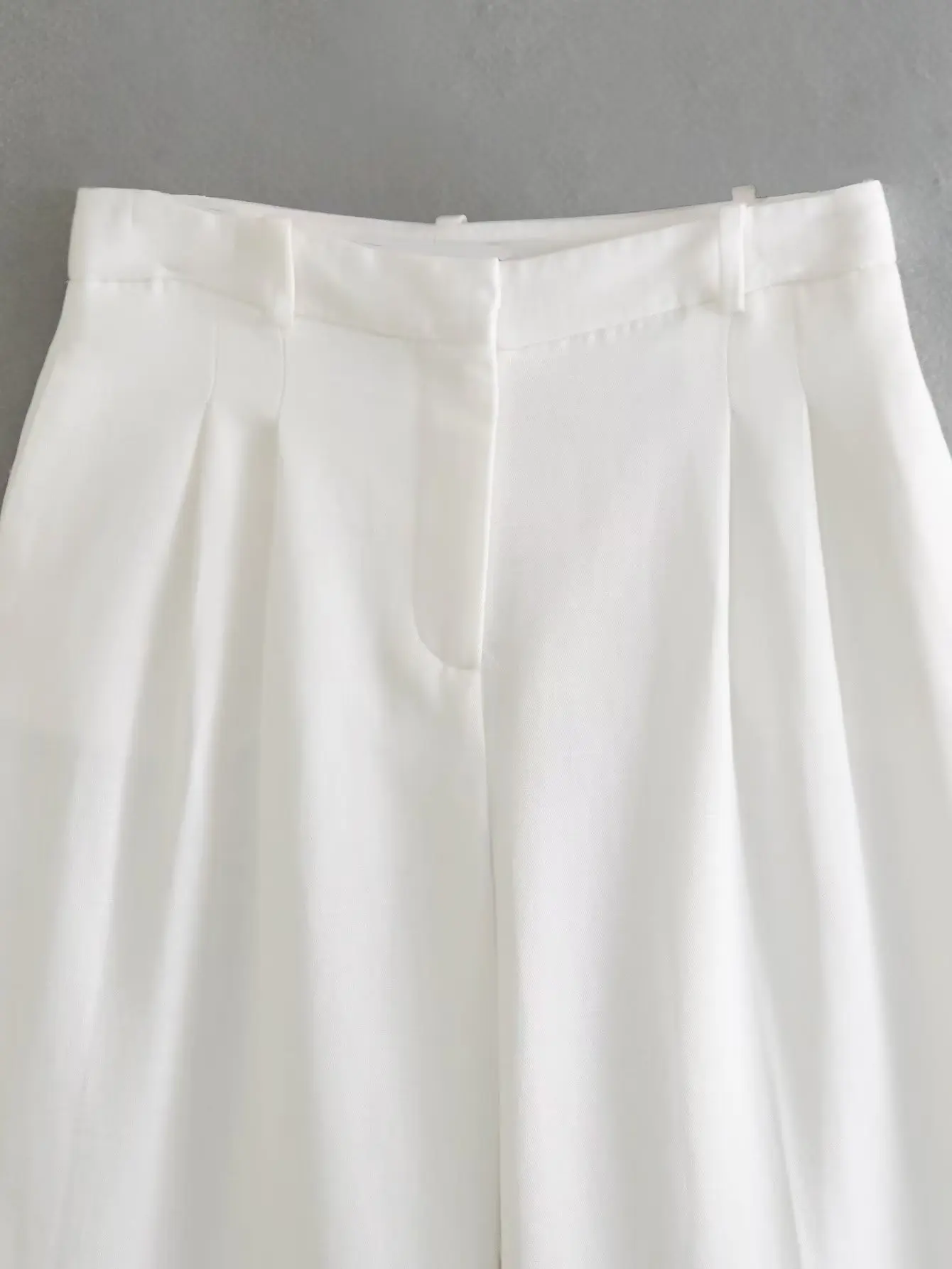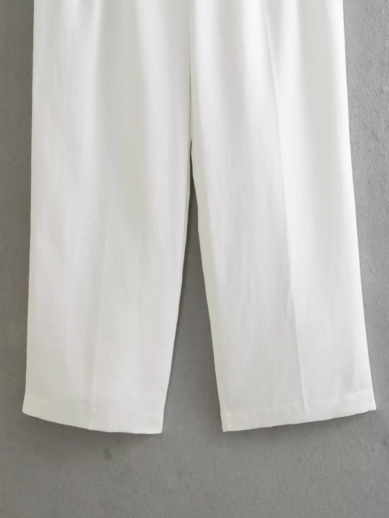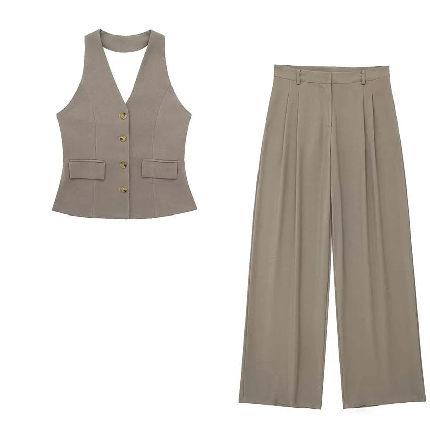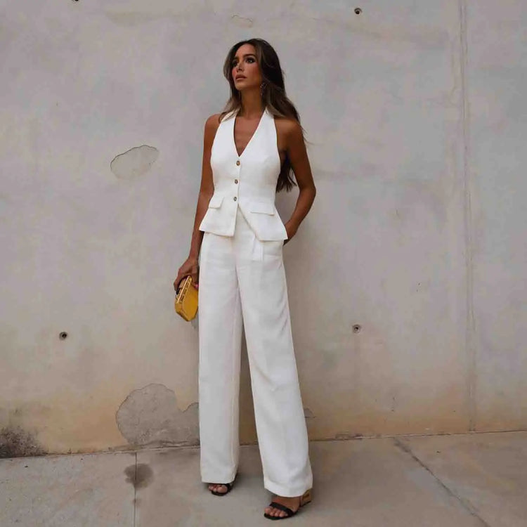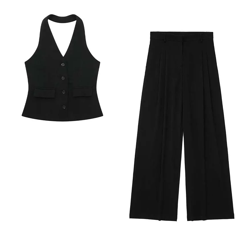 The RedPeony 2024 Fashion Chic Halter Neck Collar Blouse and pleated Wide-leg Pants Suit offers a sophisticated blend of style and comfort. The halter neck design enhances the neckline, while the pleated wide-leg pants provide ease of movement. This 2-piece suit is ideal for versatile styling in various settings.
