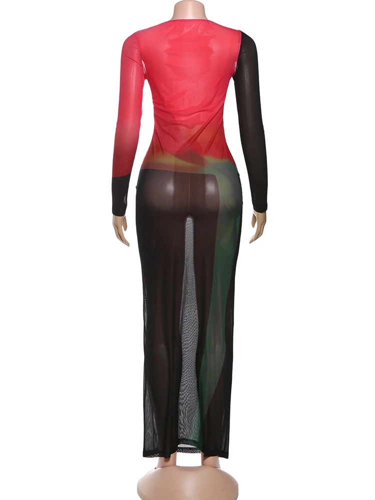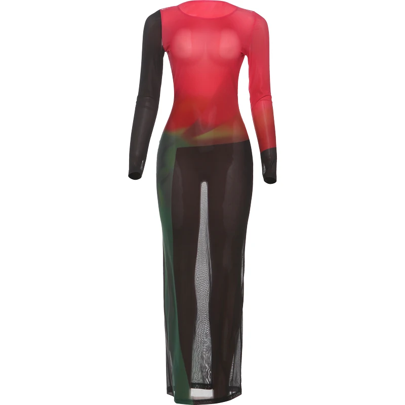 The Weird Puss Sexy Patchwork Maxi Dress features a gradient color design with a full-sleeve o-neck, crafted for elegance in evening and prom settings. Its bodycon silhouette highlights the figure, offering a sophisticated yet simple aesthetic suitable for formal occasions. Ideal for those seeking a blend of style and comfort.