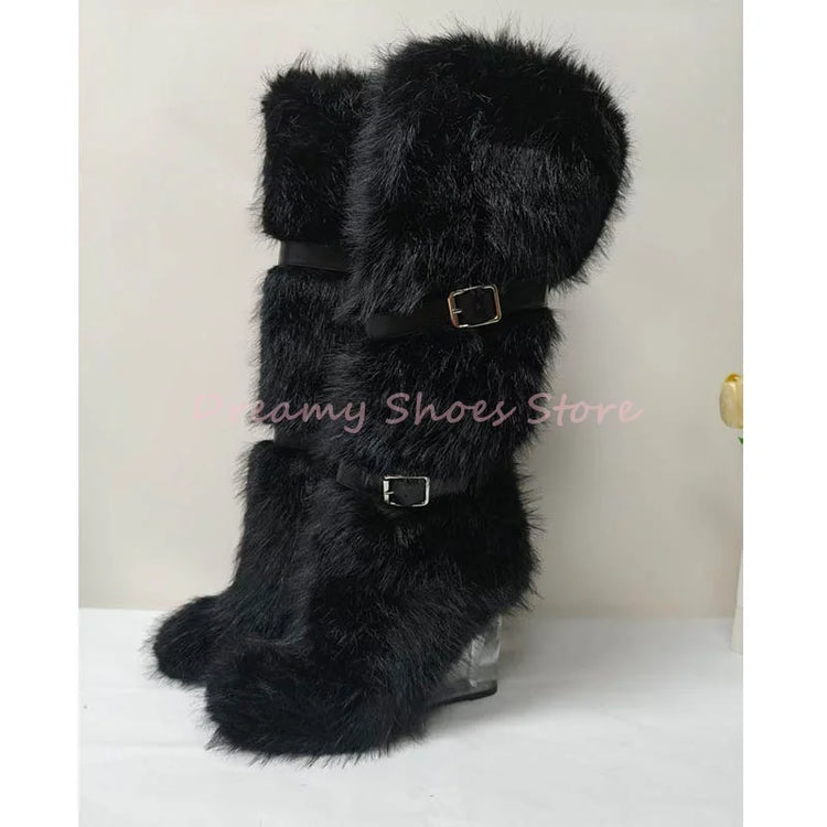 White Fur Platform Wedges Knee High Boots Women Belt Buckle Transparent Heel Slip On Boots Sweet Fashion Warm Party Banquet Shoe.