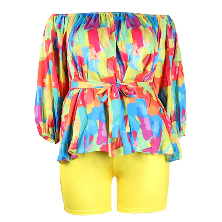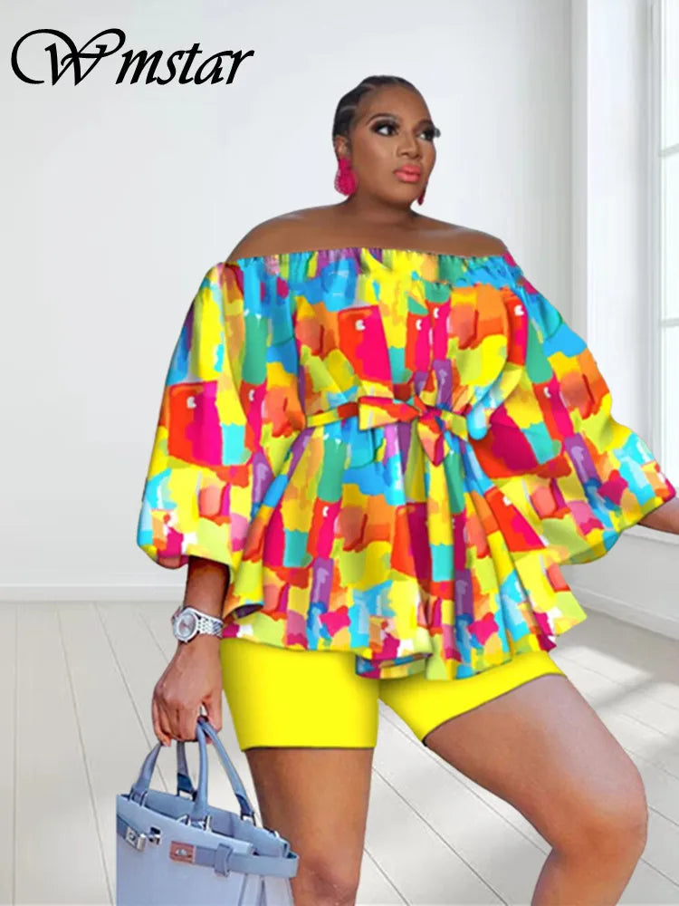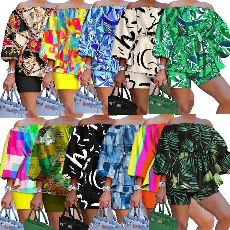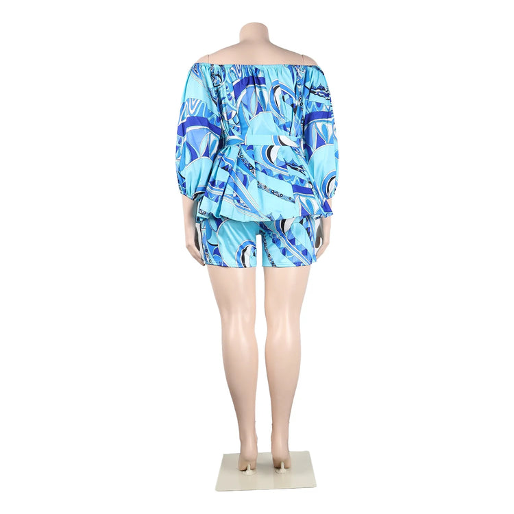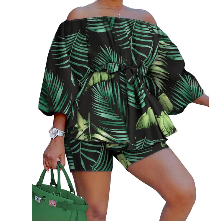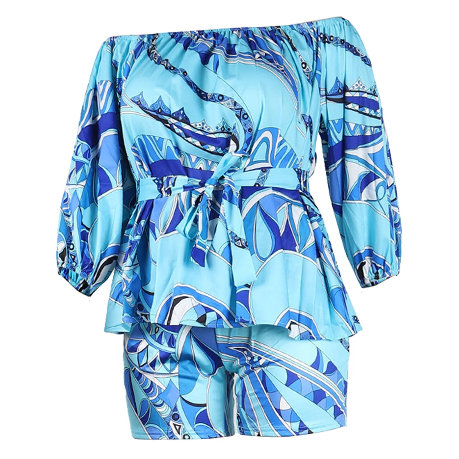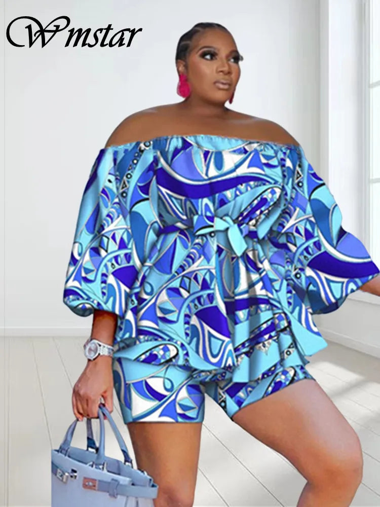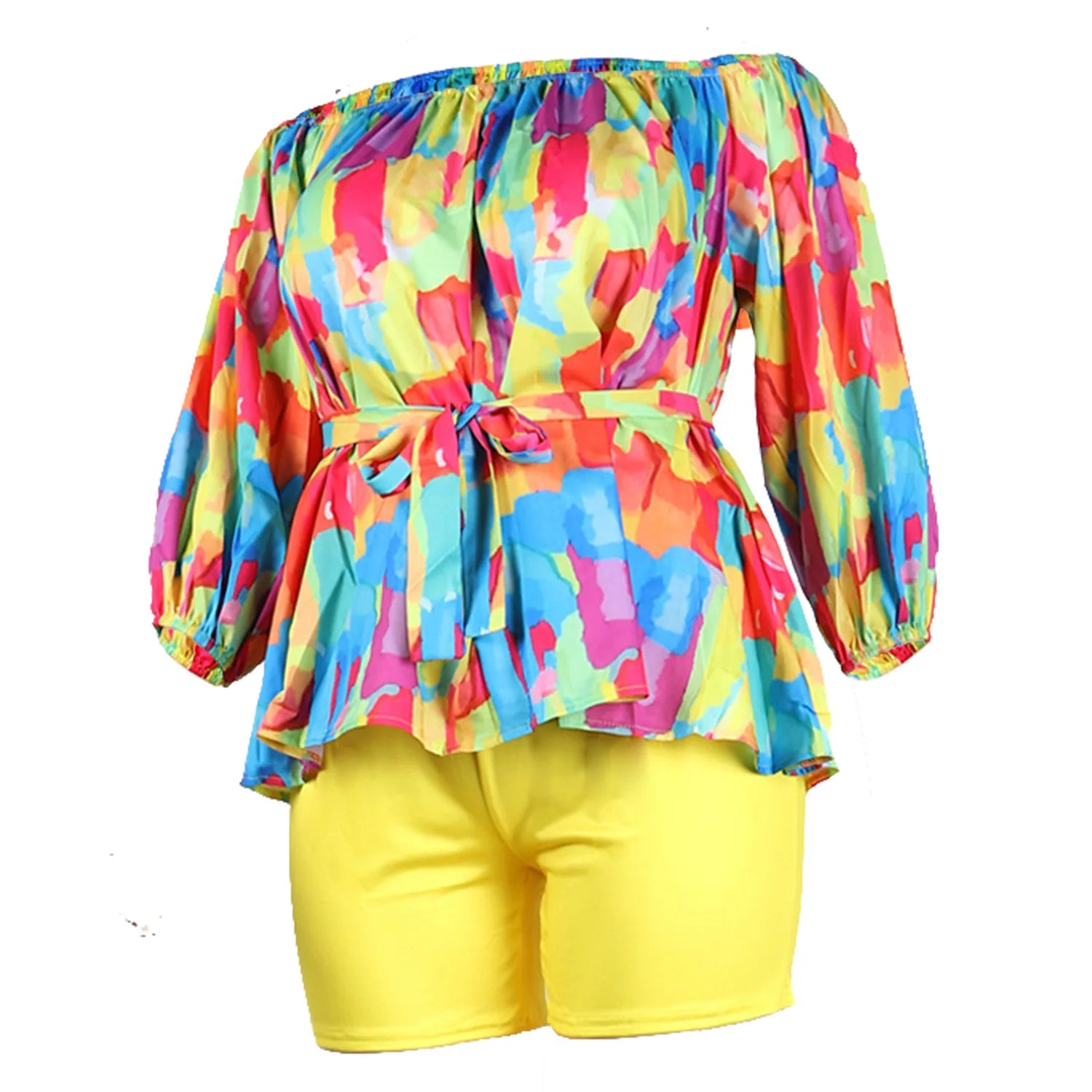 Plus size Two Piece Set Women Off Shoulder Printed Short Sets Top Pants Sweet Suit Summer Wholesale Dropshipping L-3XL.