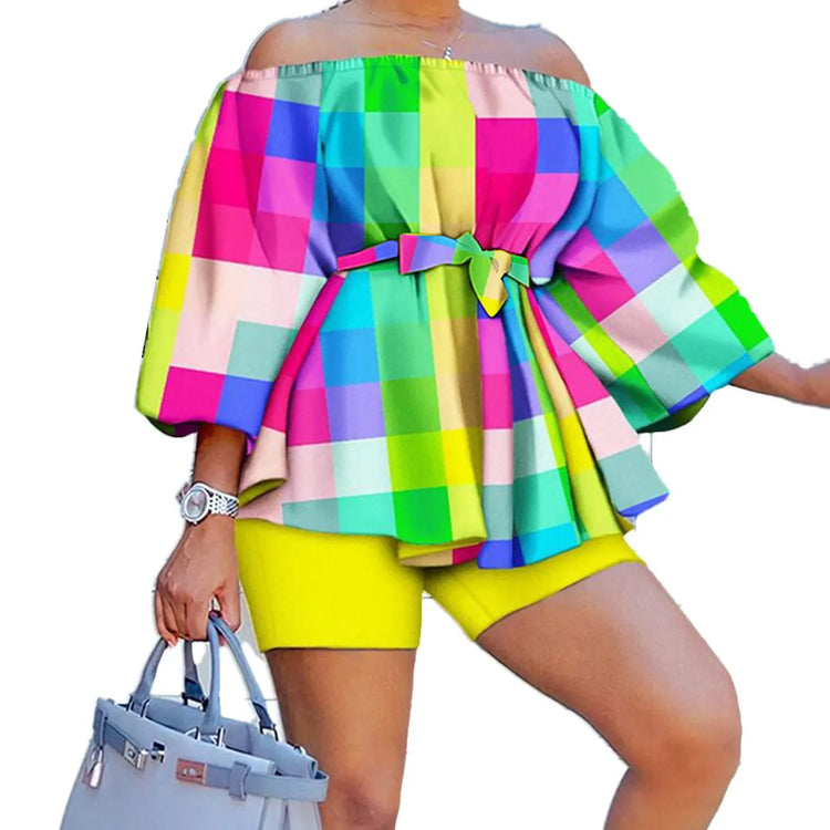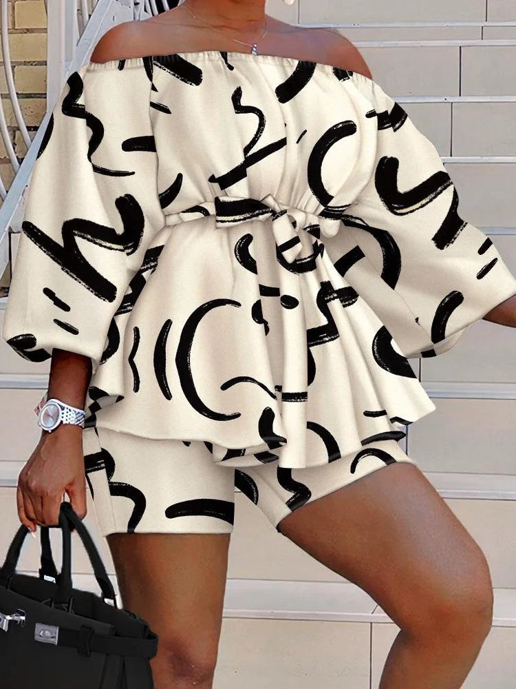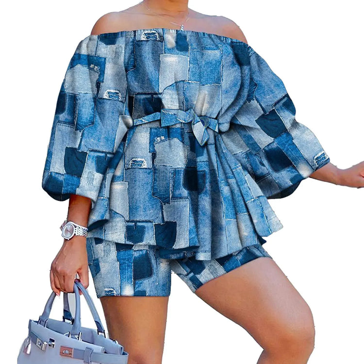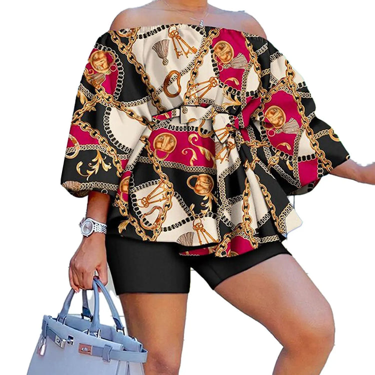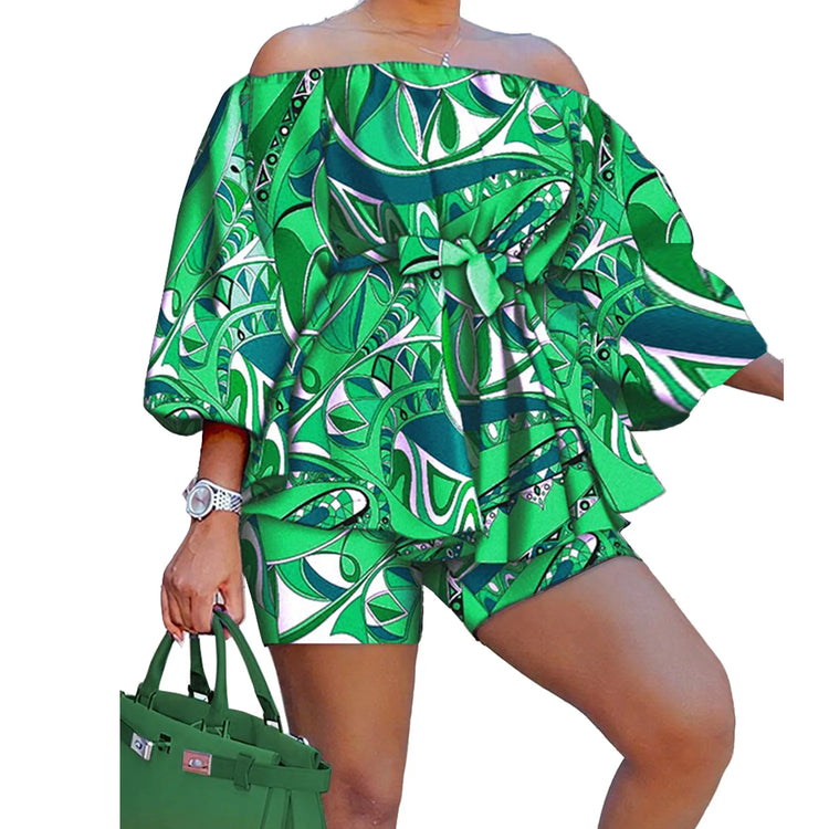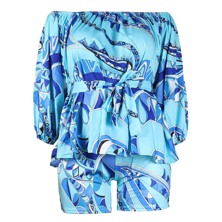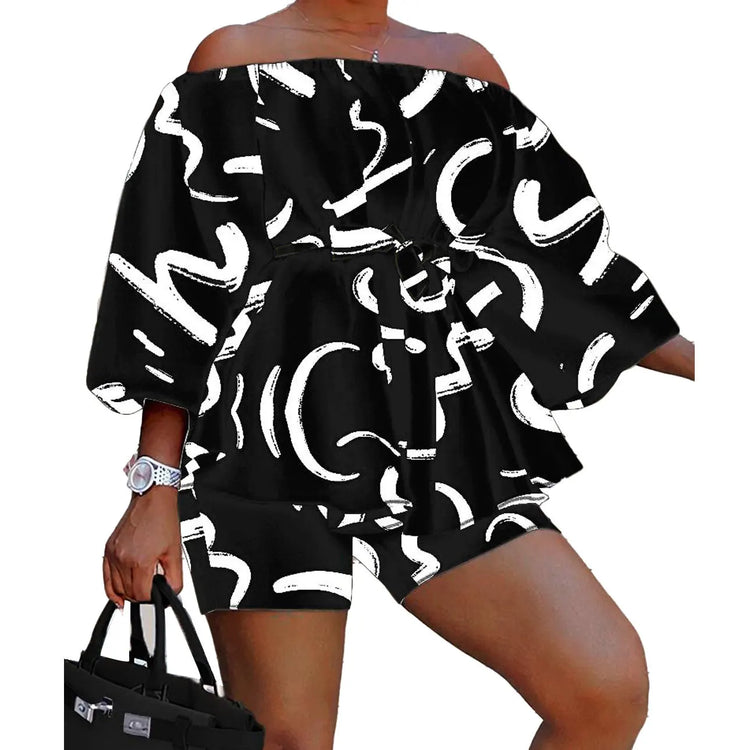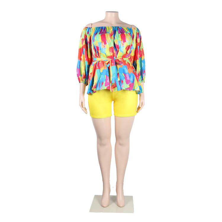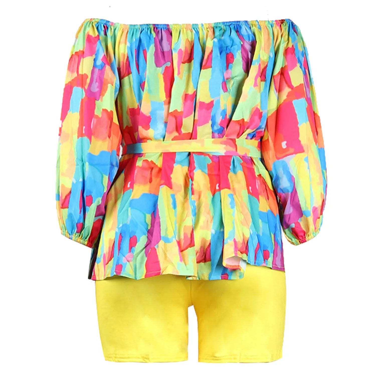Plus size Two Piece Set Women Off Shoulder Printed Short Sets Top Pants Sweet Suit Summer Wholesale Dropshipping L-3XL.